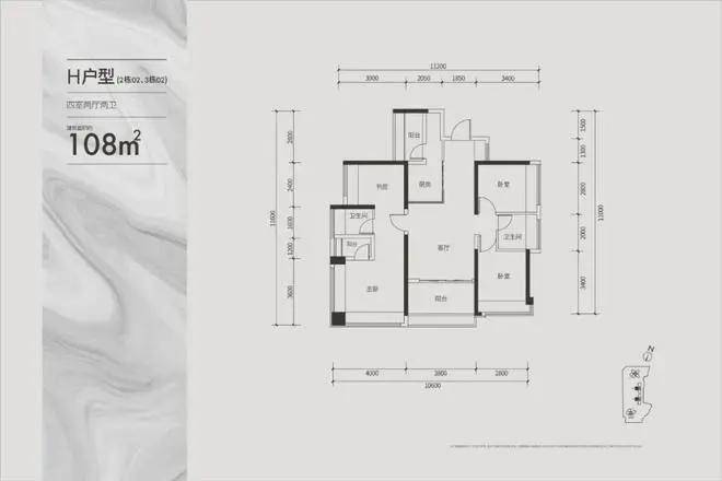 建面约108㎡通透四房户型