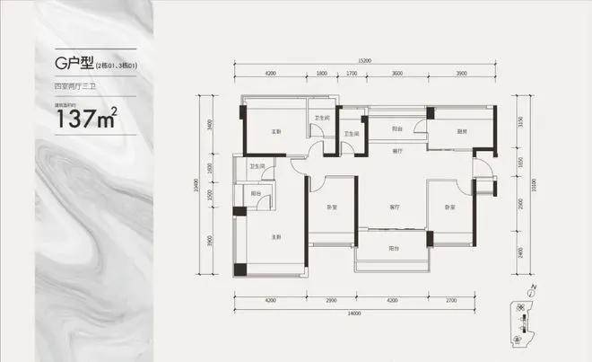 建面约137㎡双套间户型(四房三卫)