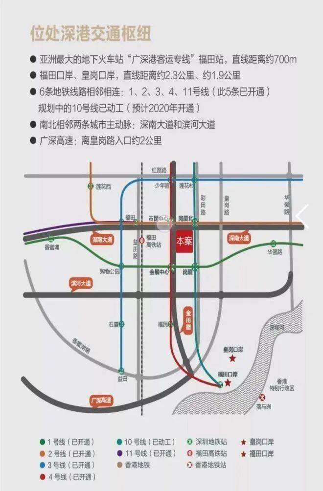 交通方面:位于福田CBD核心区域,深圳市中心,虽然深圳是多中心布局,但是福田无论是从地理位置、配套资源还是经济政治上都有无可替代的地位。