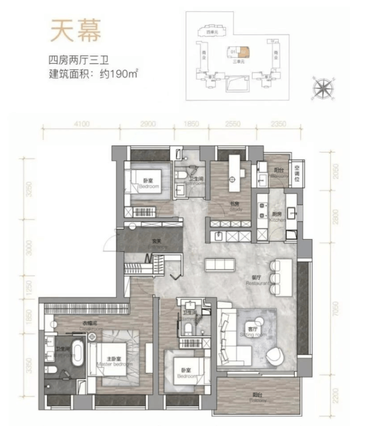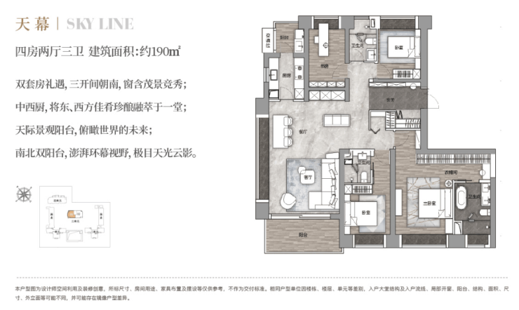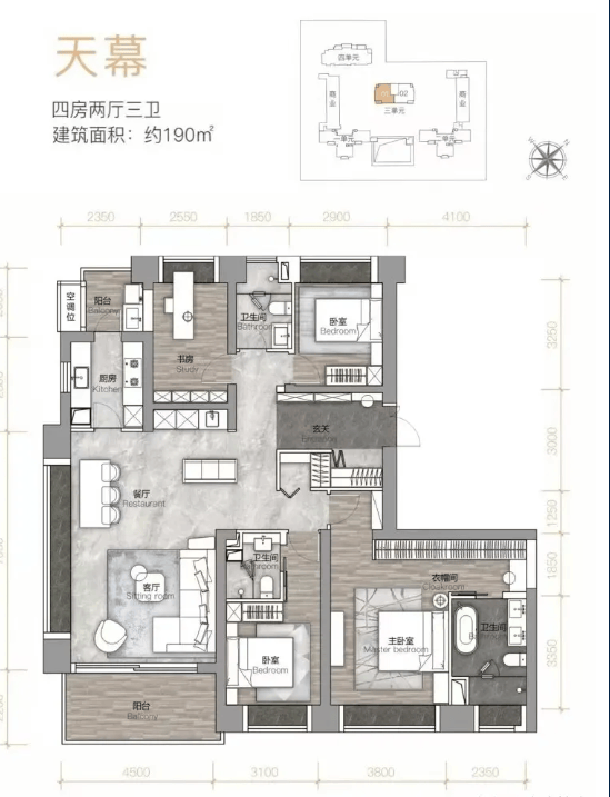190㎡四房三卫,竖厅双主卧设计,独立玄关和入户,空间上较为宽敞,但是也有不少浪费面积。