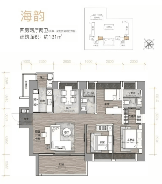 131㎡三房两卫,南北头通户型,客厅开间5.8米,带一个大阳台,主卧南北通透。