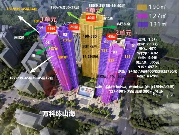 万科臻山海由4座高层和超高层住宅、裙房组成,其中:一、二单元高141米45层、三单元高138米40层,四单元高90米29层。