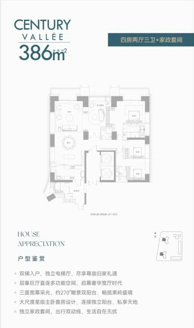 【约386㎡4房3卫】双梯入户,独立电梯厅,阔绰横厅直连多功能空间,三面舒适采光,主次卧双套房,270°环幕视野,还有独立家政套间,西朝向看名商高尔夫和大河沙生态长廊。