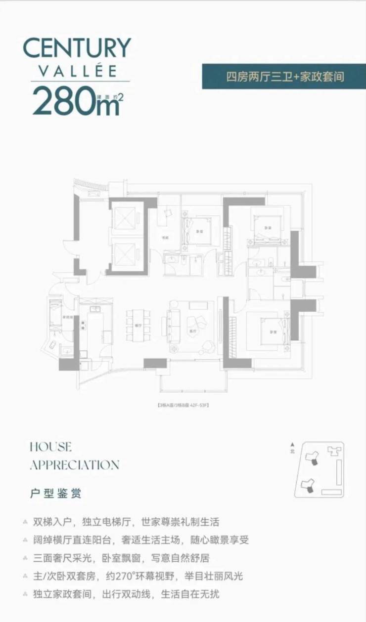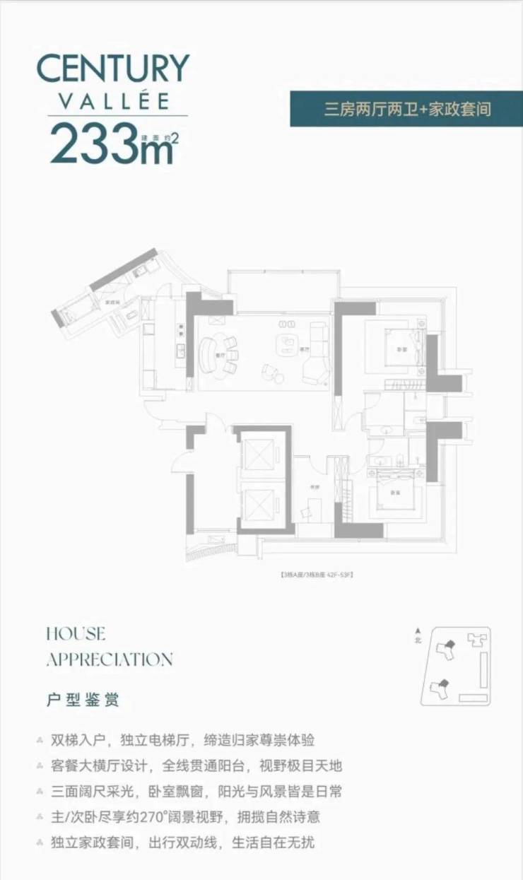 【约233㎡3房2卫】双梯入户,独立电梯厅,餐客大横厅贯通阳台,三面采光,主次卧尽享270°环幕视野,还有独立家政套间,西北朝向看名商和沙河高尔夫;