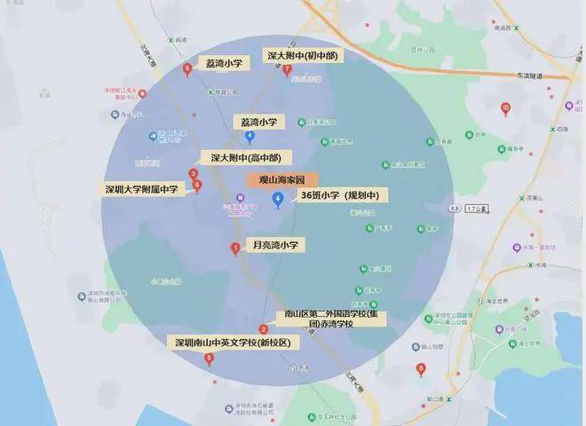 教育上,项目东北侧空地规划的是一所36班小学学校,根据南山区教育教育局2024年秋季招生学区划分,小学学区划分在南山实验教育集团荔湾小学,距离约500米,初中学区划分在深大附中初中部,距离约1.1公里。