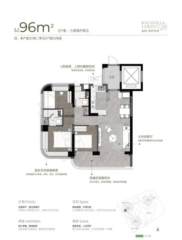 户型采用建筑新规设计,建面约96-142㎡,户户大阳台
