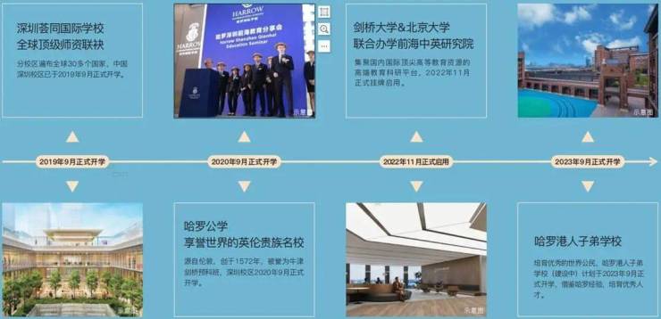 前海目前落实3+1所国际级教育学府,世界著名学校英国哈罗公学(已开学)、哈罗港人子弟学校(在建中)、美国荟同国际学校(已开学),以及剑桥大学&北京大学联合办学前海中英研究院(已开学)。