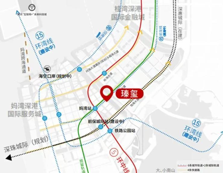 从项目步行5分钟,约500米就可到5号线妈湾站,1站到达铁路公园站可换乘15号线,此外项目距离深惠城际前保站约1公里,可快速到达南山、福田、宝安。