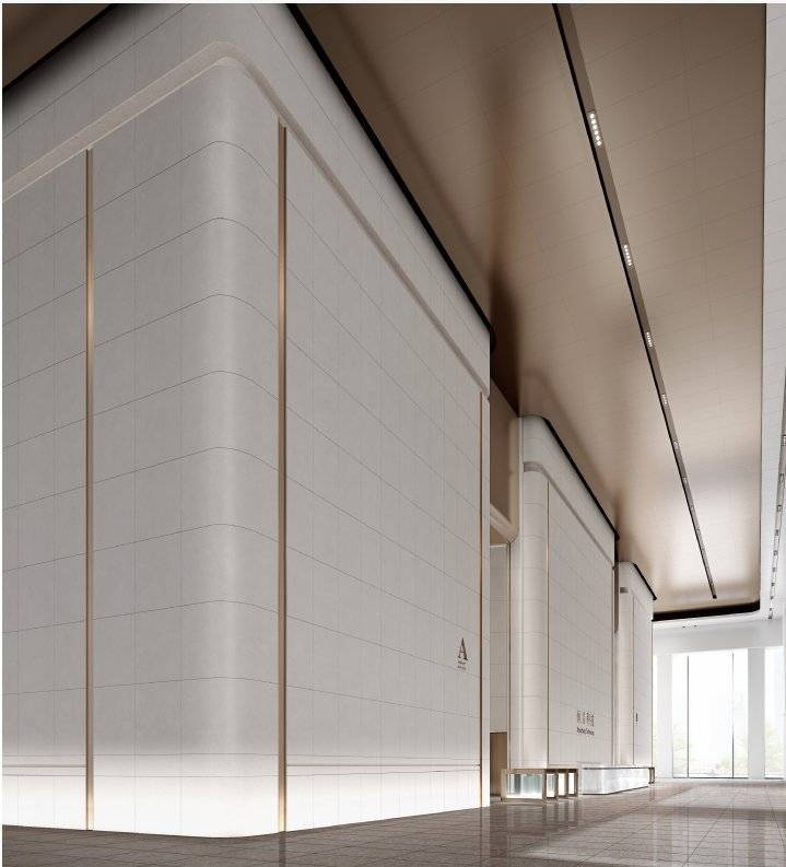 ⾸层⼤堂层⾼约16⽶,呼应名企⽓度,雍容不凡。古铜不锈钢天花,漫天红云,金光耀眼,寓意鸿运高照。