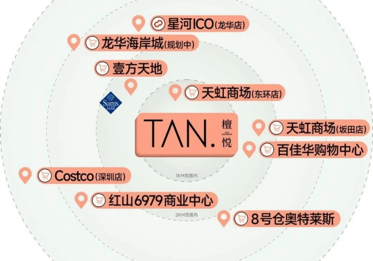 项目自带特色商业街,并且紧邻项目有天虹商场(东环店),距离壹方天地(建面约60万㎡航母级体验式商业集群)约1.5km,周边还有山姆会员店、天虹商场(坂田店)以及Costco会员旗舰店