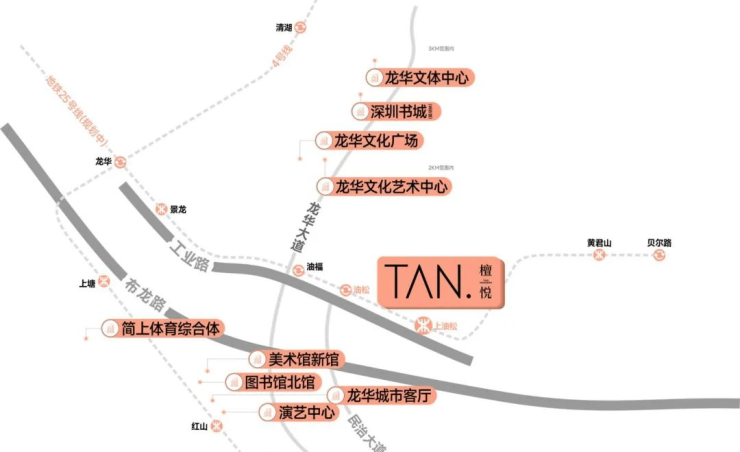 项目3公里范围内有龙华文化广场、龙华文体中心、深圳书城-龙华城、深圳市美术馆新馆(试运营)、深圳市图书馆北馆 (试运营) 、深圳市文化馆新馆 (建设中) 等市政级文化配套、超核绿心公园