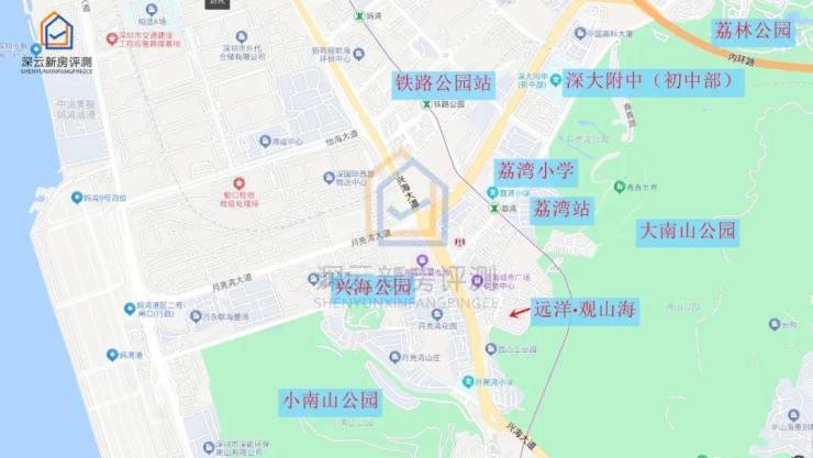 观山海家园位于南山区,兴海大道与沿山路交汇处东南侧,紧邻大南山,距离5号线“荔湾站”约800米。由远洋集团开发,总占地面积约4.24万㎡,总建面约16.3万㎡,容积率为2.65,绿化率30.85%。