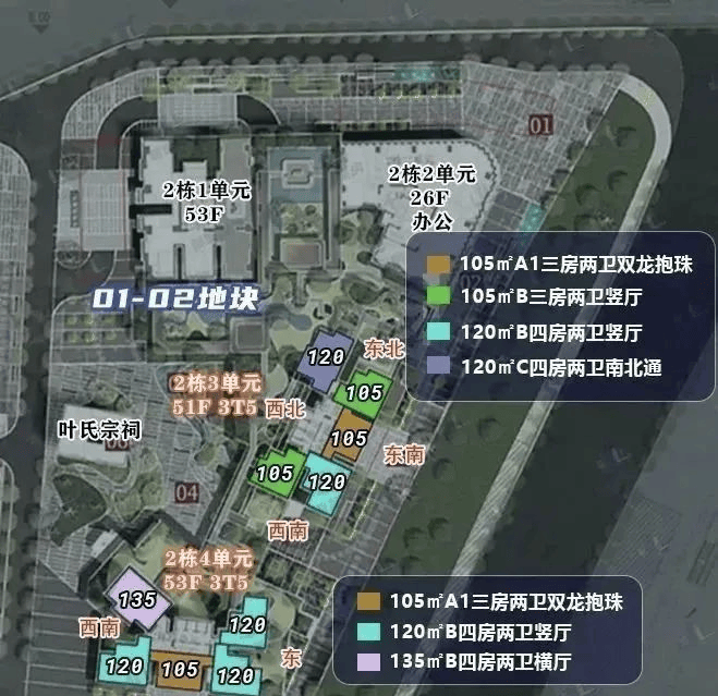 105㎡有两个户型,分别为A1双龙抱珠以及B户型传统竖厅