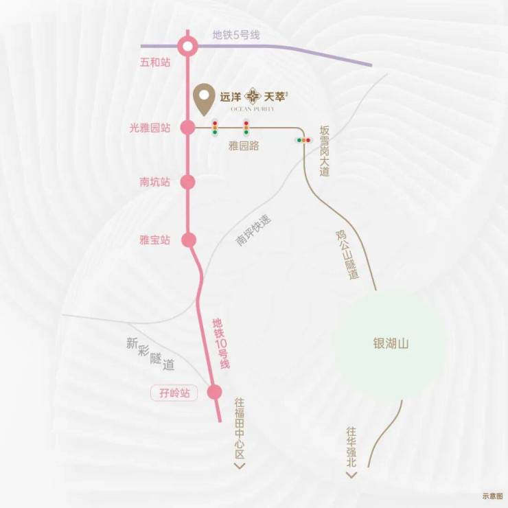 交通 楼下无缝连接10号线光雅园地铁站,3个站到福田岗厦,1站到五和转乘5号线2站到深圳北,半小小时内可直达前海,西丽,布吉等深圳中心区域。