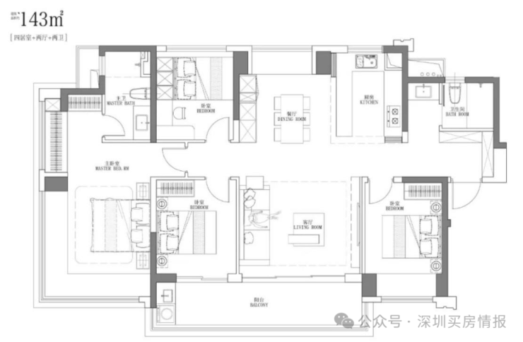 3A栋,推出约146套房源,含:约126㎡:4房两卫、约138㎡:3+1房两卫、约143㎡:4房两卫3个面积段。