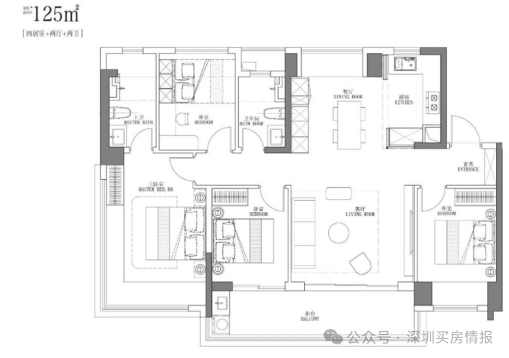 竖厅南北通透格局,进门入户玄关,客厅4.3米开间,餐客厅分离设计,四开间朝南,全屋八面飘窗,主卧做到了270度转角无柱飘窗,U型厨房,卫生间干湿分离,得房率约95.2%(包含赠送),客厅连接次卧出7.1米长的观景大阳台,全部主朝西南向,看大运公园景观。