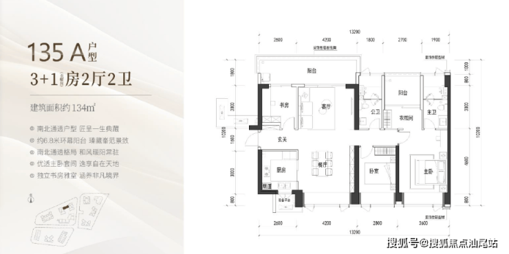 经典的双龙抱珠布局,主人空间与客卧空间互不干扰,具备私密性优势。并且户型方正,实用三房两厅两卫。朝南向四开间面宽共约 13.2m,全明空间,采光极佳。这个户型含赠送半阳台和飘窗的面积后使用率可达约 83%,这在超高层中是比较高的使用率。