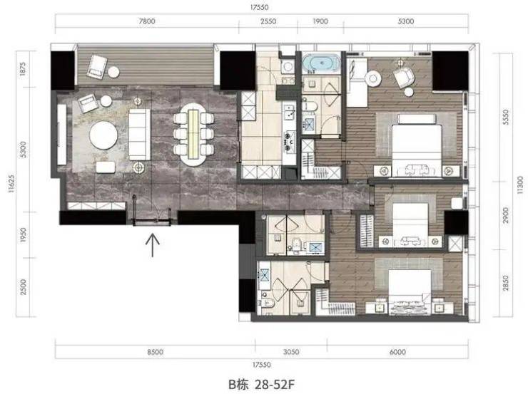 所有340㎡户型位于B栋28-52F正东朝向,23米观海面,向海而生,无言的霸气。