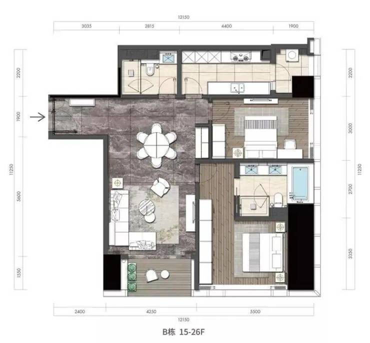 总面积超过50㎡的大主卧,规划有主人衣帽间、卫生间、开放式书房(也可以自由功能组合)、大卧床、收藏品储藏密室的“五星套房”布局,功能多元。