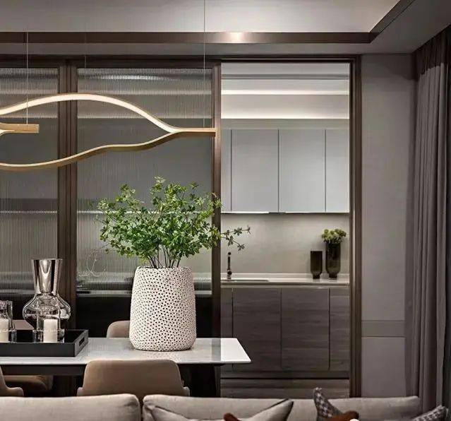 空间中采用光滑的和现代的材质以保持与建筑一致,并在不同材料的大胆混合中,展现独特的奢华气质。客厅定制的地板为迪奥金,电视背景墙石材则是金纹爵士白。石材上面金色的花纹的方向总是朝着上方,寓意着欣欣向荣,蒸蒸日上。整体简洁大气显得阔绰。