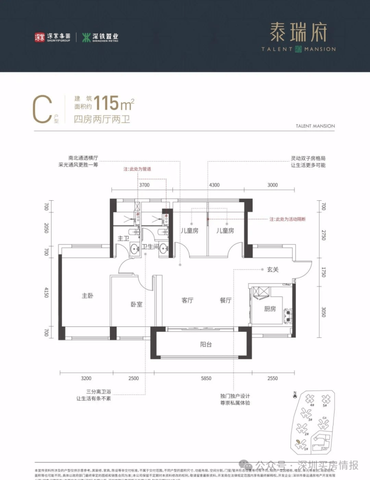 115㎡的4房2厅2卫,设计的是横厅南北通透格局,进门入户玄关,客餐厅5.85米开间,四开间朝南,4个卧室分别做的3.2米/2.5米/2.15米/2.15米的宽度,主卧南北通透设计,U型厨房,公卫三段式分离,得房率:77.48%(不含赠送),阳台主朝西南或东南向。