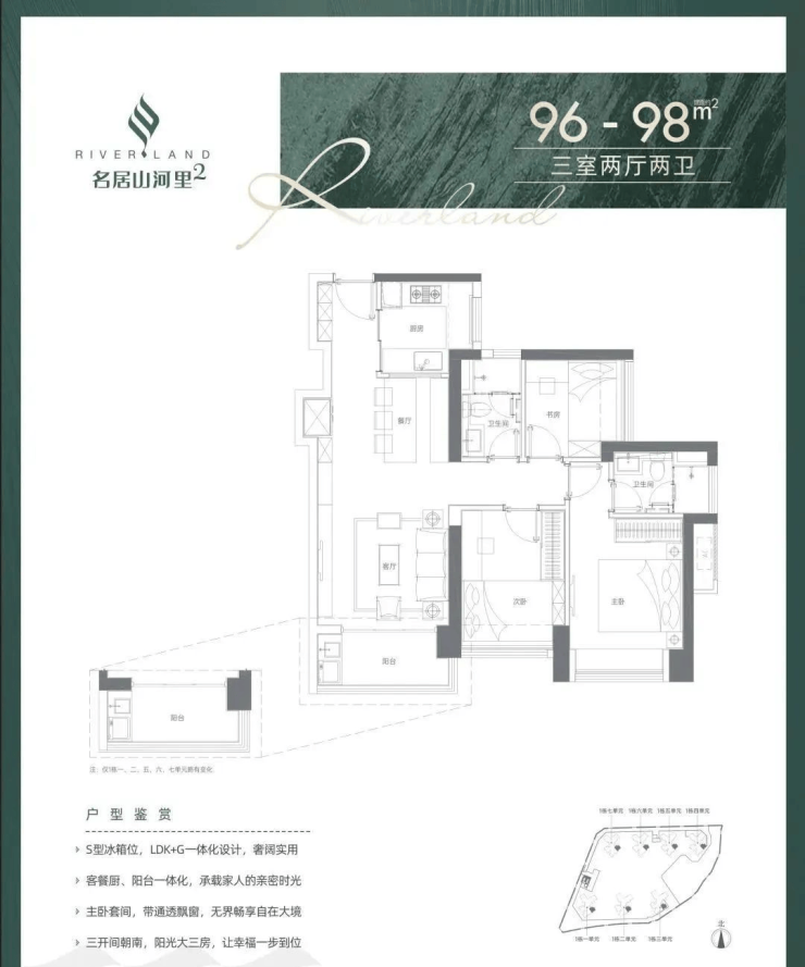 96-98平3房2厅2卫:东南朝向,不含赠送使用率在74%
