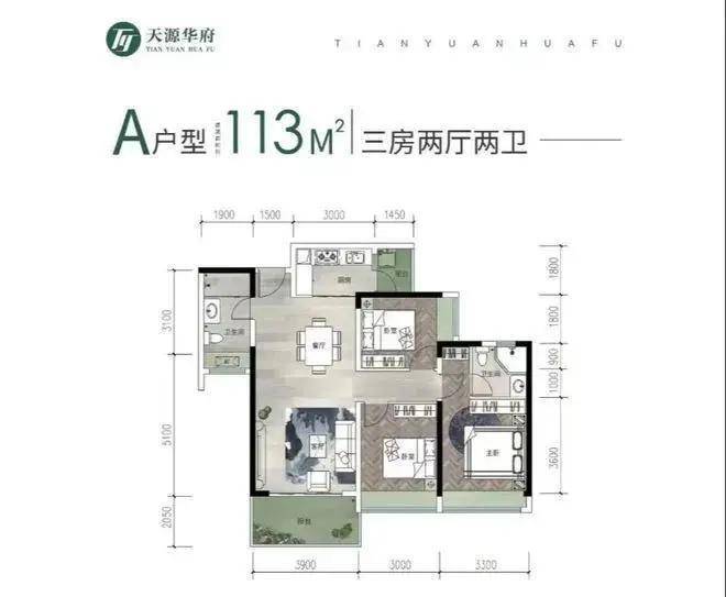 113㎡的3房2厅2卫(A户型),设计的是竖厅格局,LDKB(客餐厨阳)四位一体,客厅3.9米开间,3个卧室分别是2.7/3/3.3米的宽度,L型厨房,得房率:87.01%(包含赠送),阳台2.05米进深,西南朝向。