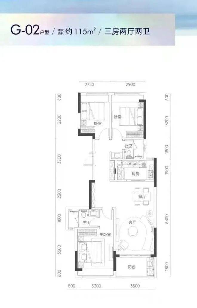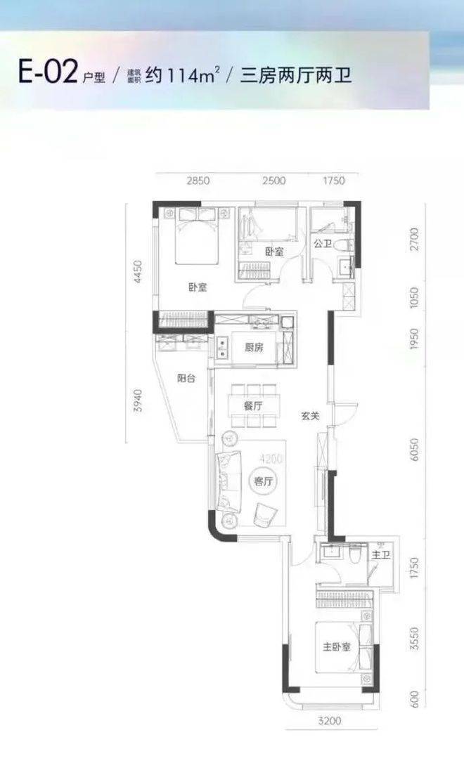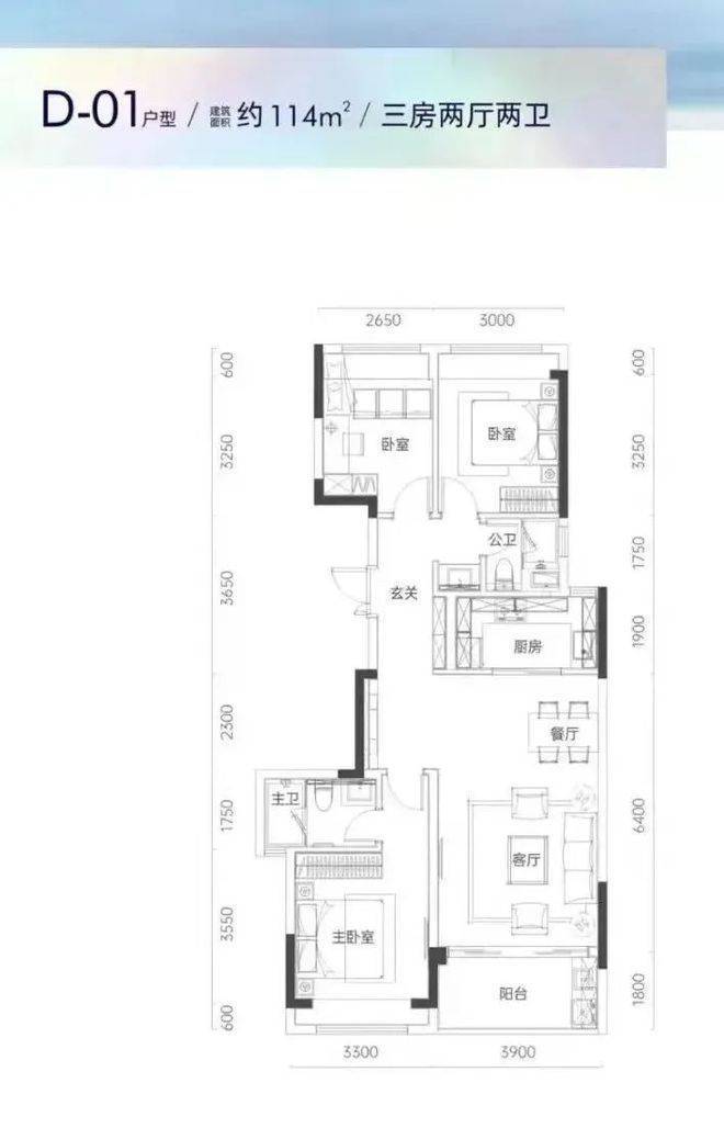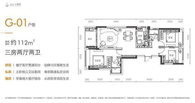 G座的112㎡户型与D座114㎡户型,户型格局一致,仅在客厅开间上差了40cm,进深上多出5cm。