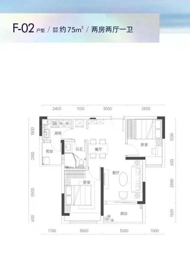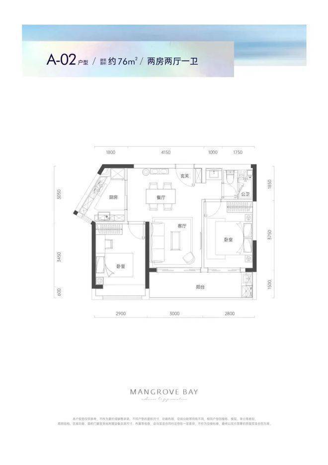 A-02 76㎡户型:T2布局,是整个小区最方正,朝向最好的户型。户型有三开间面都朝东南向,且阳台拉通了客厅和卧室,阳台很大;两个卧室的面积都相对宽松,卫生间做了干湿分离;缺点是客厅面积比较小,厨房不规则,导致转角出的操作台面使用效率不高;