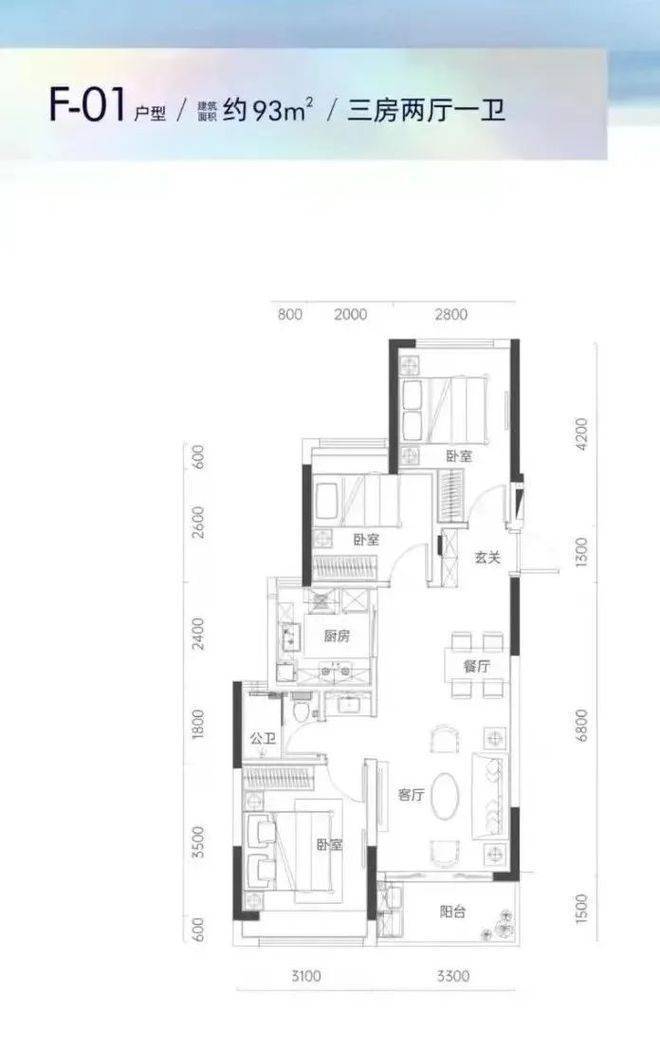 94-103㎡2房1卫820-900万单价:8.2-10万