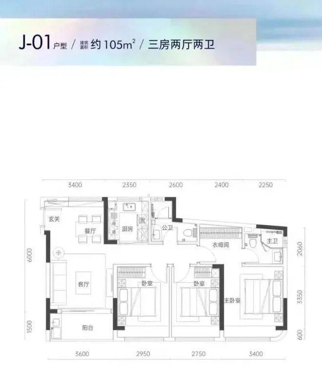 J-03 79㎡户型:T3布局,主朝向朝西偏北,但这个户型有180°双面采光;
