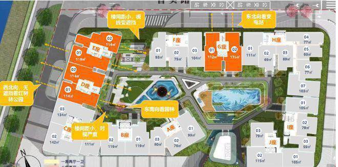 景观上上:D/E两个单元西偏北向是无遮挡的红树林生态公园,景观资源很好,东南向看内部园林;G座东北向看的是变电站,西南向看内部园林。但因为内部园林面积小,楼间距小,因此景观上D座>E座>G座