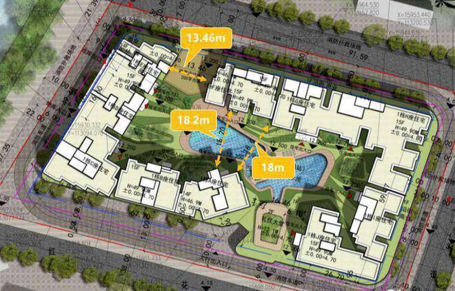 因为项目限高50m,且地块较小,而容积率4.74,为了做足容积率,每户进深较大(通俗说就是每个户型都很长),楼间距小,最小楼间距13.46m,中间楼间距18m左右,遮挡和对视都比较严重。