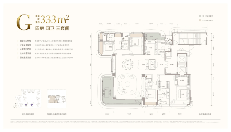257/330㎡大平层:楼王产品,270° 环幕海景,大方厅 + 中西厨,三套房奢适布局。