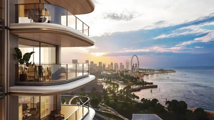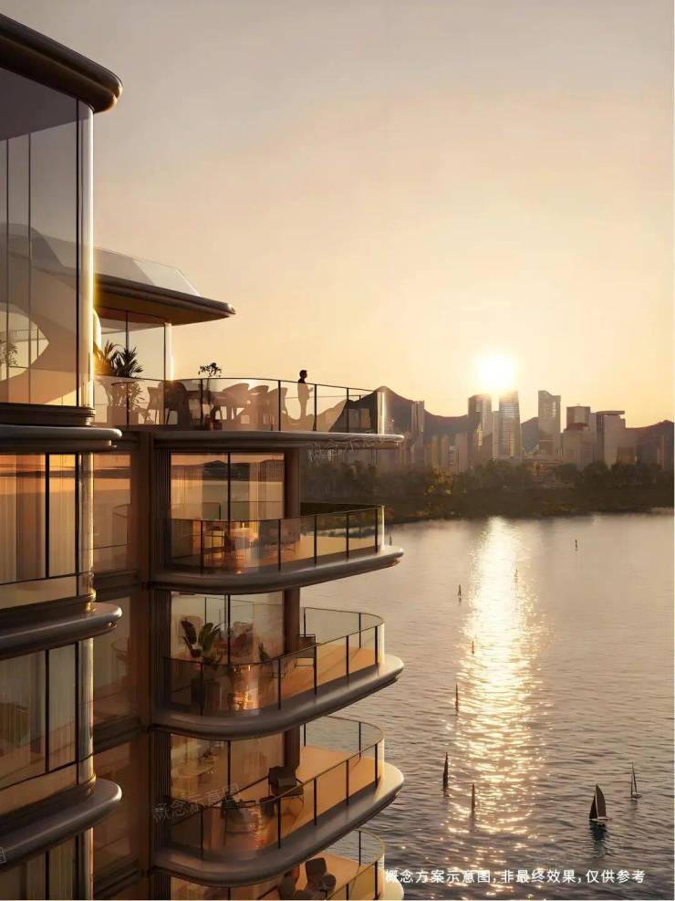 观潮府建筑立面官方设计主题:时代风帆,是项目最具辨识度的城市天际线标志。整体极简现代、无多余造型,挺拔优雅、质感高级,区别于传统欧式豪宅,是属于深圳前海的国际滨海现代立面。竖向金属线条如千帆竞发桅杆,挺拔向上;横向玻璃幕墙随光影流转,与前海潮汐同频共振;白天通透干净、夜晚灯光璀璨,是前海天际线标志性建筑。弧形玻璃幕墙 + 竖向氟碳喷涂铝合金线条 + 大面积铝板幕墙,高端耐久、抗盐蚀耐海风;全圆弧倒角玻璃,柔和流畅,呼应海浪弧度,同时提升观景视野;超大弧形观景阳台,逐层退台设计,立面富有韵律层次。