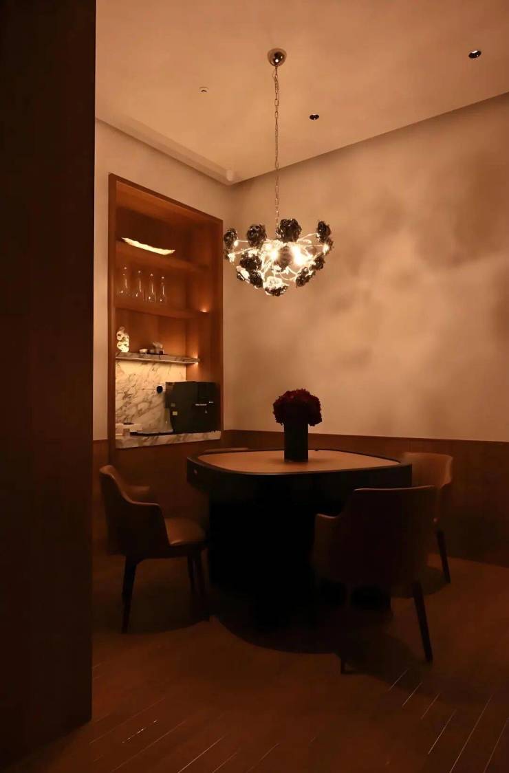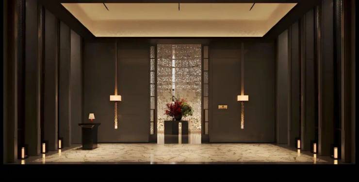 大门内侧直达9 米超高挑高车马厅,豪宅标配落客仪式,车行直达地下、人行步入园林完全分流;穹顶弧形天花 + 嵌入式灯光系统,中央镜面水景,藏风生水起之意,光影静谧高级。