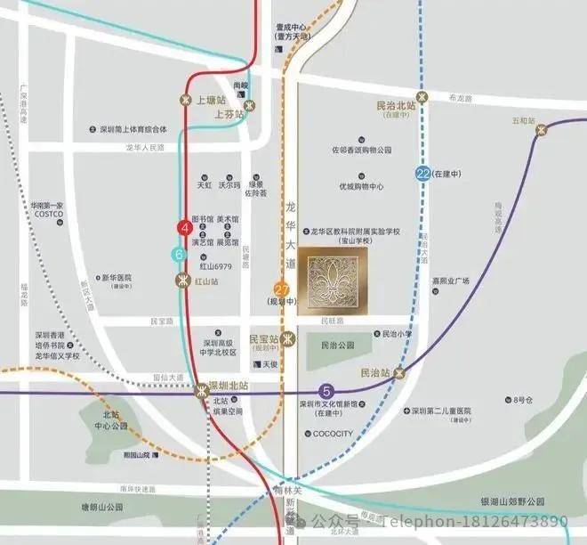 l 深圳北站高铁枢纽、地铁4/5/6号线已开通,22号线在建中,27号线规划中,已进入招标阶段,深大城际和深惠城际在建中,项目距离深大城际民治北站约900米,未来约20分钟到达机场,五地铁+二城际交汇环绕,五横六纵多维立体路网,无界城心繁华