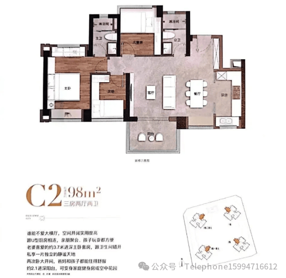 98平方米的3房2厅2卫户型,设计为横厅格局,南北通透,L型厨房,主卧双飘窗通透设计。