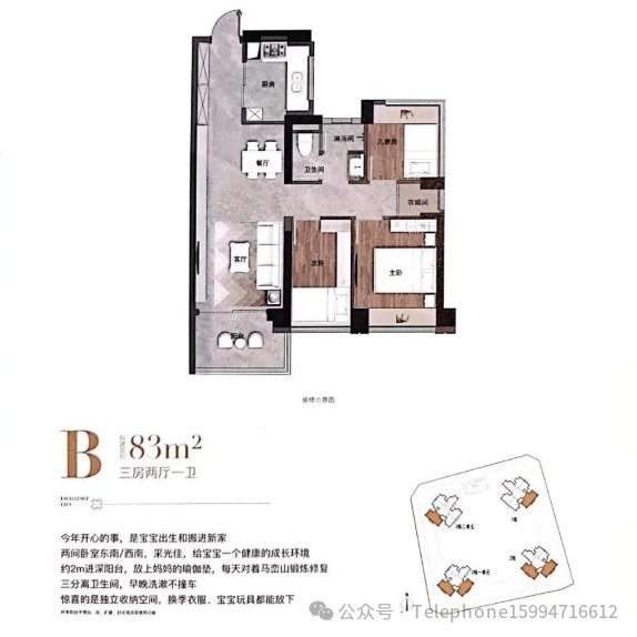 83平方米的3房2厅1卫户型,同样为竖厅格局,客厅3.2米开间,L型厨房,西南及东南朝向。