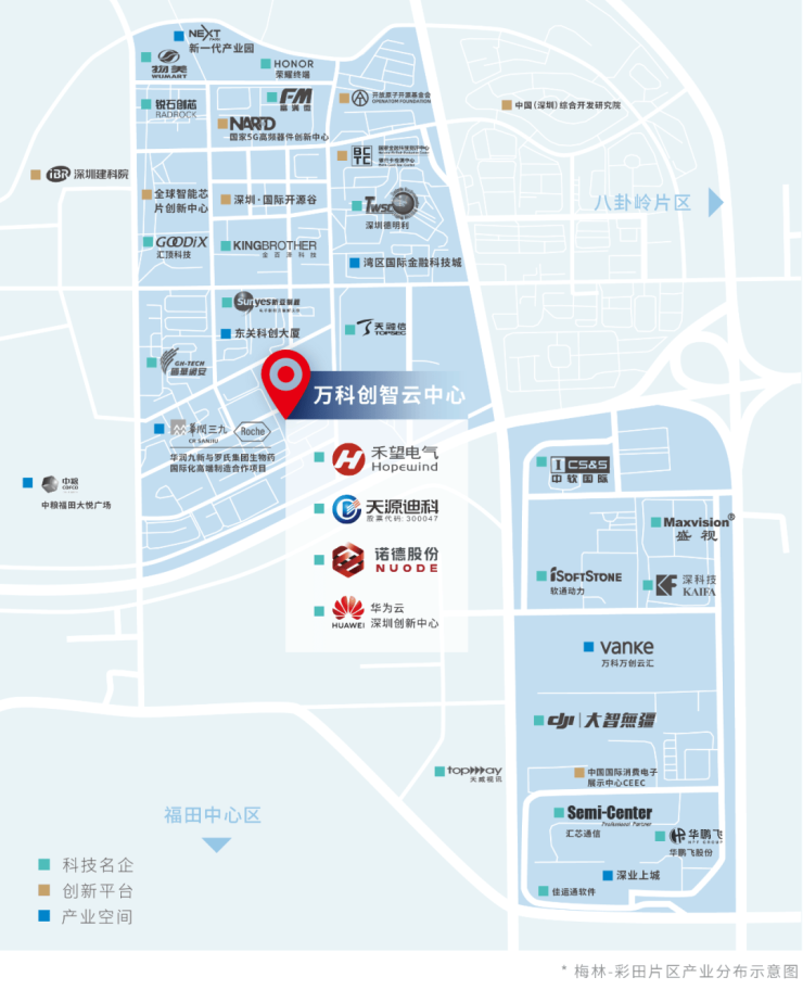 梅林-彩田片区战略定位为 “深圳智谷”,预计到2025年前片区总开发量可达540万㎡,目前已汇聚荣耀终端、汇顶科技等科技龙头企业总部及世界500强名企,引进了广东省5G中高频器件创新中心等战略平台载体,着力打造以人工智能前沿技术应用为核心的战略新兴产业集群。
