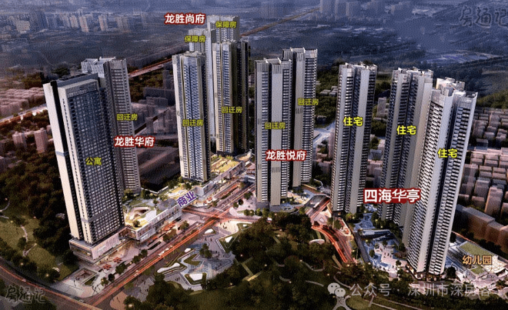 四海华亭,项目前身为“龙胜旧村城市更新单元”,共分5个地块建设,分别是龙胜华府,龙胜尚府,龙胜悦府,龙胜云坊,四海华亭,另外配建1所9年制学校,如今的龙华中学弘毅校区(龙胜学校),项目总占地面积约5.45万㎡,总建筑面积约56万㎡。