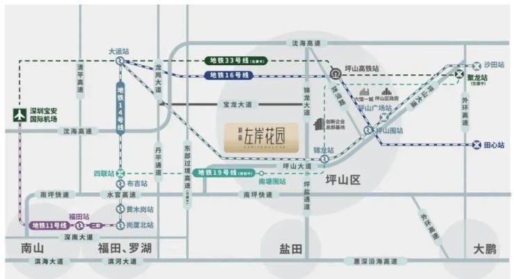 其中交通方面,地铁14号线:深圳东部首条地铁快线, 4站大运、12站福田岗厦北。地铁16号线:深圳东部组团线路,快速联通龙岗、坪山。地铁19号线(规划中):坪山首条区内地铁线,项目临近14/19号线换乘站锦龙站,南塘围站。