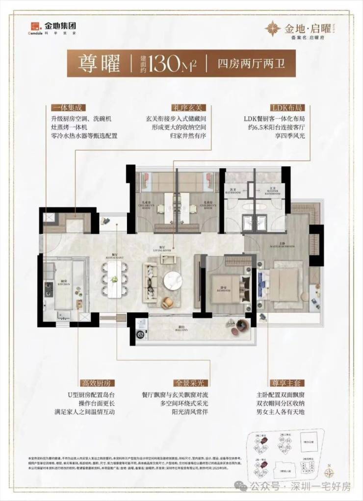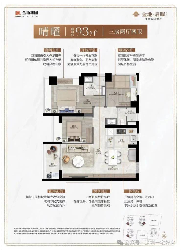作为新规住宅的代表,金地启曜府的户型设计以高得房率、全南向布局和功能多样性 为核心亮点,得房率预计可达约90%(含赠送),实际使用面积比传统户型多出约10%。