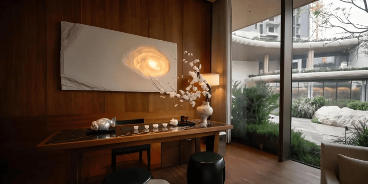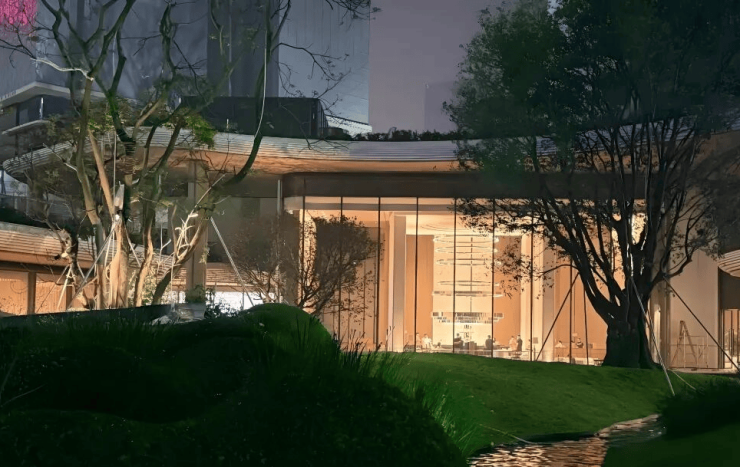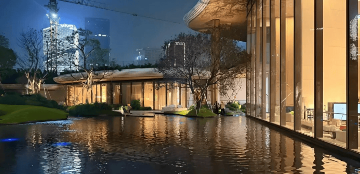 项目核心景观为5.5 万㎡三层立体台地园林,展示区即中央下沉庭院,是整个社区景观灵魂,设计理念:一心十岛、浮屿藏海、山谷秘境。展示区采用双下沉山谷式设计,区别于平面园林,利用场地高差打造高低错落、内外通透的立体景观;中央约 800㎡镜面无边水景,模拟前海潮汐海面,是展示区视觉核心;整体抬地 12 米(三层架空底盘),住宅首层相当于市政地面三层高度,完全避开道路噪音、俯瞰园林海景。全冠移植名贵乔木、多层次乔灌草,滨海耐盐树种,营造森海秘境氛围;大面积弧形石材、水洗石、木纹铝板,柔和曲线呼应海浪形态,拒绝生硬直角。
