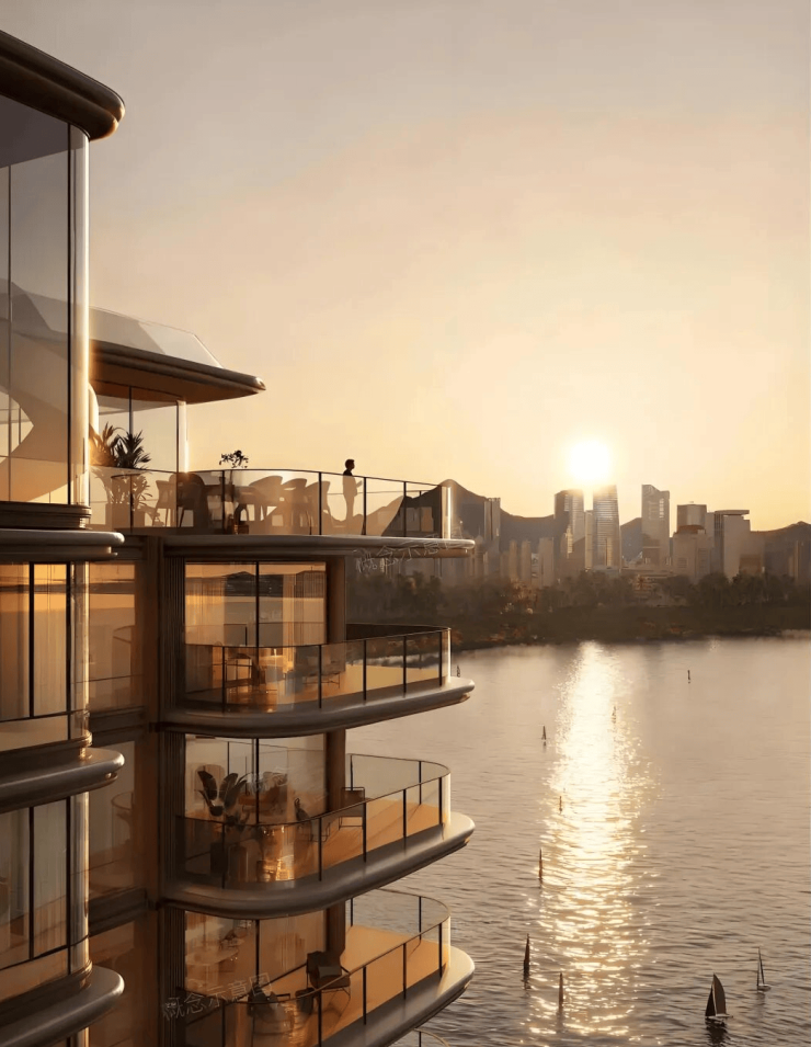 观潮府建筑立面官方设计主题:时代风帆,是项目最具辨识度的城市天际线标志。整体极简现代、无多余造型,挺拔优雅、质感高级,区别于传统欧式豪宅,是属于深圳前海的国际滨海现代立面。竖向金属线条如千帆竞发桅杆,挺拔向上;横向玻璃幕墙随光影流转,与前海潮汐同频共振;白天通透干净、夜晚灯光璀璨,是前海天际线标志性建筑。弧形玻璃幕墙 + 竖向氟碳喷涂铝合金线条 + 大面积铝板幕墙,高端耐久、抗盐蚀耐海风;全圆弧倒角玻璃,柔和流畅,呼应海浪弧度,同时提升观景视野;超大弧形观景阳台,逐层退台设计,立面富有韵律层次。