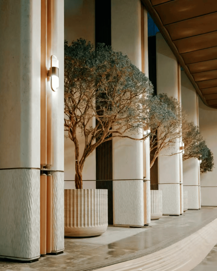 大门入园设置镜面水廊、阵列乔木、线性灯光步道,从城市喧嚣逐步过渡到静谧社区;人车完全分流、无地面车流干扰,大门不仅是形象封面,更是社区私密安全边界。