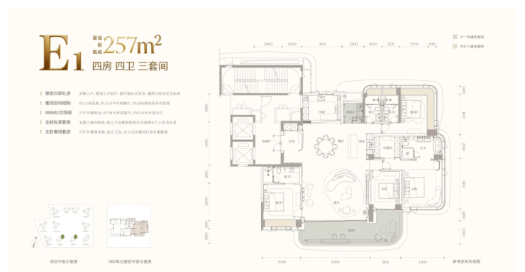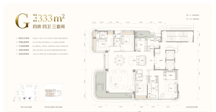 257/330㎡大平层:楼王产品,270° 环幕海景,大方厅 + 中西厨,三套房奢适布局。
