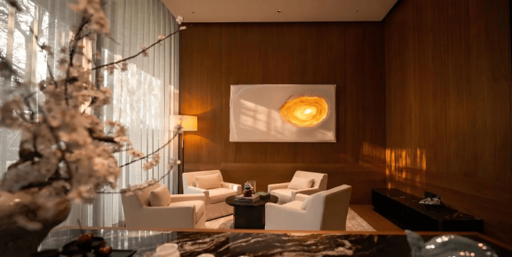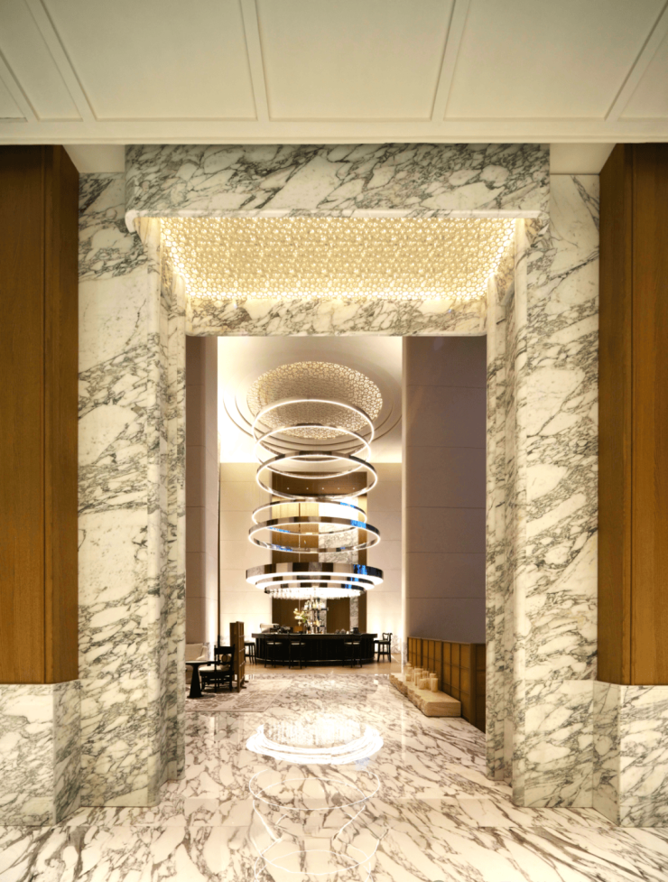 大门内侧直达9 米超高挑高车马厅,豪宅标配落客仪式,车行直达地下、人行步入园林完全分流;穹顶弧形天花 + 嵌入式灯光系统,中央镜面水景,藏风生水起之意,光影静谧高级。