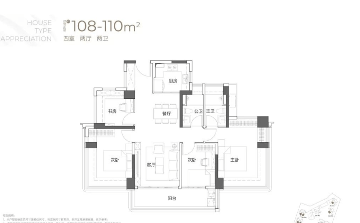 110㎡的4房2厅2卫:户型分布于1栋以及2栋2/3单元,东南、西南朝向,双龙抱珠户型。