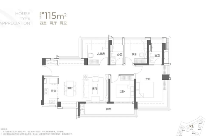 115㎡的4房2厅2卫:户型分布于1/2栋,东南、西南朝向,横厅户型但是能做到南北通,赠送率最高的户型,2栋1单元户型差异这在阳台位置的设置上。